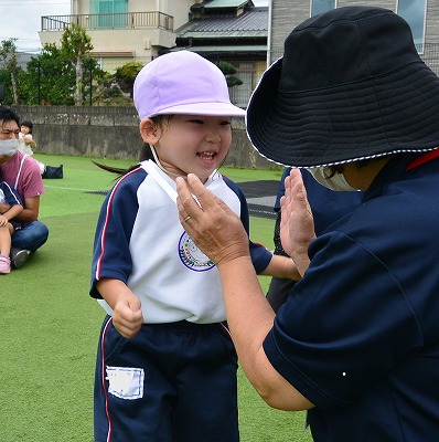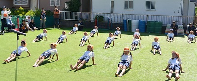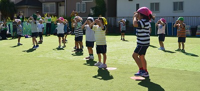 当日は、皆で円陣を組み、「ちからをあわせてゴーゴーゴー!!」の合言葉のかけ声から始まり、長縄跳び、体操と、これまで頑張ってきた運動を披露しました。