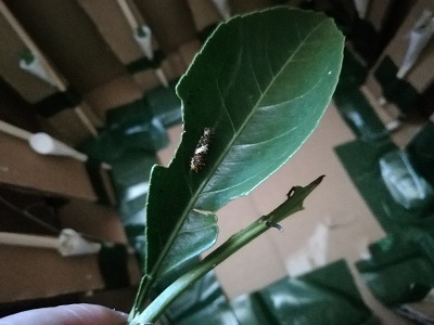 園庭で見つけたアオムシを虫かごに入れて、子どもたちが飼育してきました。アオムシは、園庭にあるミカンの若葉がお気に入りで、食べる様子を見ながら「ぱりぱり音がするね!」「たくさんたべてるね」とみんなで話しています。