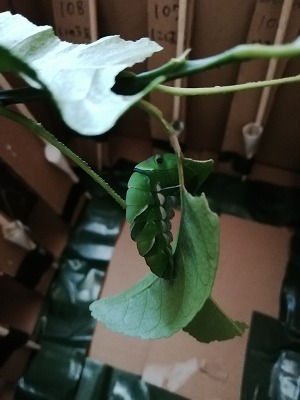 葉っぱをモリモリ食べてこんなに大きくなりました。 糸を出して茎に体を固定しました。サナギになるところです