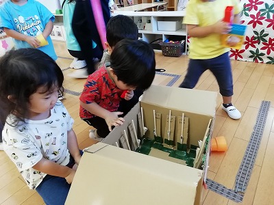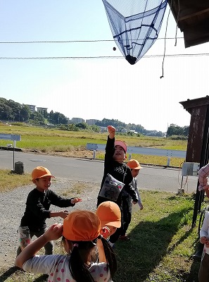 こちらは、初めての「ドングリ玉入れ」に、「はいれ~!」と叫びながら何度も挑戦していた子ども達の姿です。