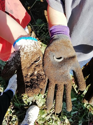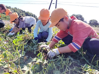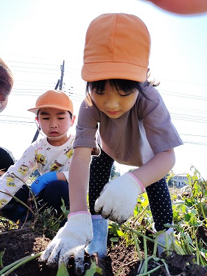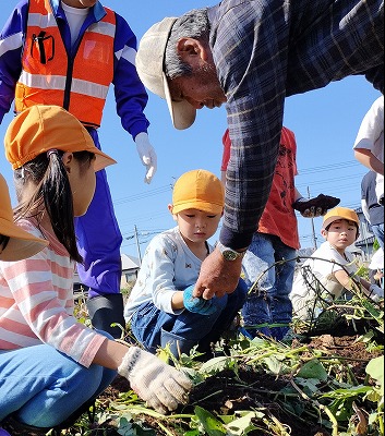 挨拶をして、掘り方の説明を聞き、早速、掘り始めました。「ここにあるぞ〜!」と農家の方がツルの根元にある芋を教えてくれました。夢中で掘っている子ども達も「ここにもあったよ」「おおきい〜」と掘った芋を手にして見せてくれました。