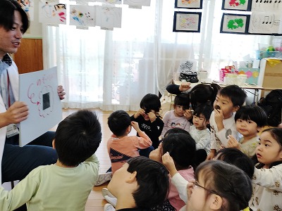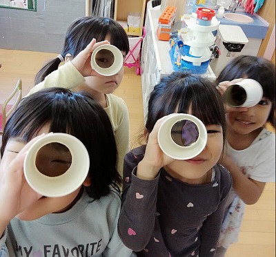 まず、科学館の先生が紙芝居を使って「ステンドグラスとは」「偏光板とは」など、わかりやすく説明してくださいました。偏光板は液晶ディスプレイ等に使われているそうで、身近にたくさんある物ですが、私たち保育士も知らないことがたくさんありました。 偏光板2枚を重ねて動かすと、光を通したり遮断したりします。写真は、偏光板を手に「黒くなった!!」「色が変わった!」と変化に驚く3歳児クラスの子どもたち。