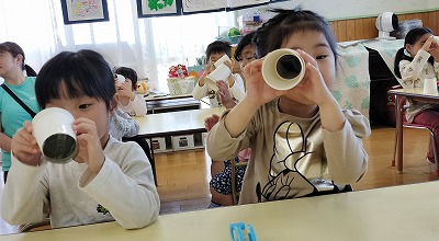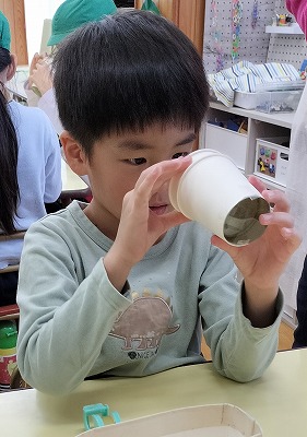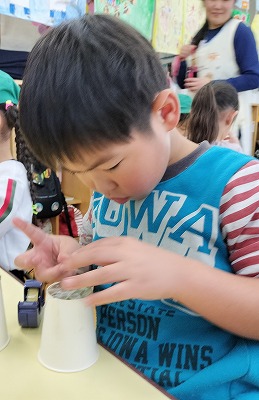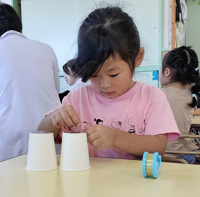 次は、みんなでステンドグラス作りです。底をくり抜いた紙コップに偏光板を貼ったものを2個作り、片方の偏光板にセロハンテープを貼り、2つのコップを重ねて回転させながらのぞくと、色や模様が変化していきます。 子ども達はセロハンテープを何枚も貼り重ね、その度に偏光板をのぞきこみ、「不思議~!! また色が変わったよ」「お花の形みたい」と友達と見せあい、大喜びでした。
