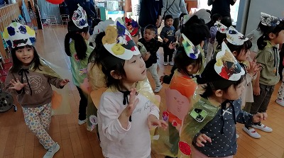 3歳児は、紅白リレーがプログラム最初の競技です。受け取ったバトンを手に、みんな一生懸命に走りました。親子競技は、『3匹のこぶたと4匹めのこぶた』という絵本を題材にしてバルーンを使ったものです。こぶた達がおうちを作り終え、遊んでいるとオオカミが「クンクンクン~こぶたの匂いがするぞ~」とやってきて、こぶた達は、バルーンの中に隠れます。オオカミの一吹きでおうちが飛ばされてしまうと、オオカミに食べられないように親子で逃げ回ります。なりきって遊ぶ子ども達の様子に保護者の皆さんも笑っていました。