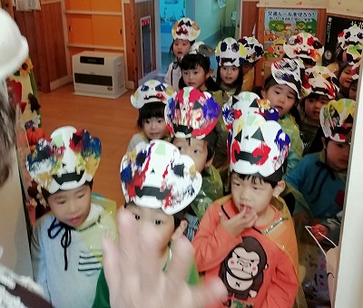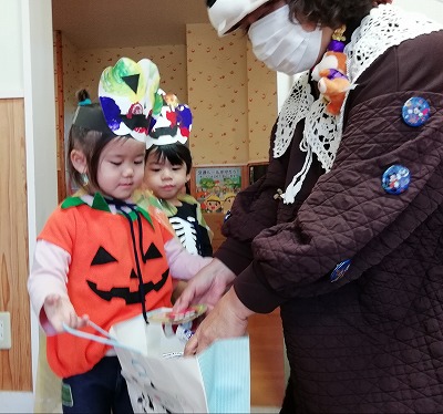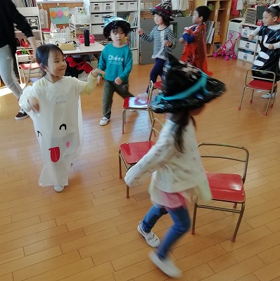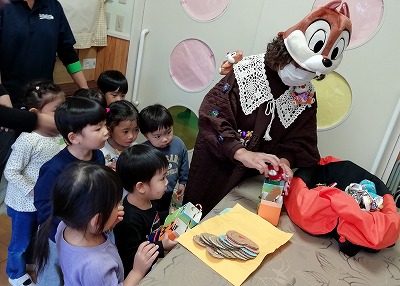 パーティ当日は、皆でハロウィンの由来を聞き、『ハハハハ ハロウィン』でダンス、4、5歳児は、ハロウィン・バスケットやハロウィン爆弾などのゲームも楽しみました。 パーティが終わると、「園長先生をおどかしにいこうよ」と園長先生の部屋へ。 すると…、「チップとぴょんたの部屋」という表札が…。「誰がいるんだろう」と言いながらも、大事な合言葉「トリック オア トリート!!」と大きな声で言うと、「チップとデール」のチップが出てきて、慌てて「お菓子をあげるからいたずらしないで」とお菓子を袋にたくさん入れてくれました。「かわいいかったね」「ぴょんた、いなかったね」と言いながら部屋に戻り、袋の中身を見た子ども達は、「ドーナツがある」「キャンディだ」と大喜びでした(注:もちろん本物のお菓子ではありません)。