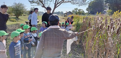自然観察員の方が、ガマ(別名ミズクサ)の話をしてくださいました。 ガマの穂が飛ぶ様子の説明の際に出てきた芯の部分を見た子ども達は、「ウインナーだ!」と大笑いしていました。ガマの穂が串にささったフランクフルトに見えたようです。
