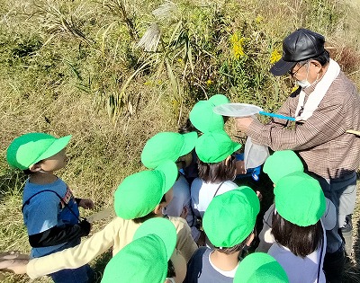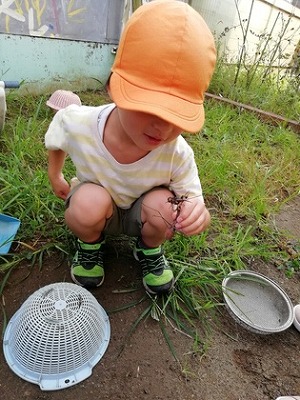 4、5歳児は、自然観察ができる、谷津ミュージアム(我孫子市岡発戸、都部)へ行きました。お父さんたちとたくさん話しながら歩き、 ミュージアムに着くと、早速、バッタやトンボ、カマキリをみつけて捕まえました。
