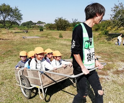 「これに乗ってごらん!」と自然観察員の方に声をかけられ、リアカーに乗り込み出発!! 運転手さんは、もちろんお父さんです。御協力くださったお父さんたち、ありがとうございました!