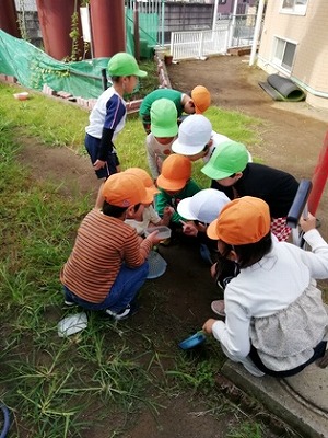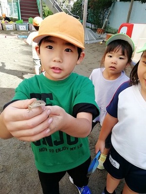 園庭では、あちらこちらから「みつけた!!」「いたよ!」と虫探しに夢中の子ども達の声が響き、「みせて!」と友達も駆けよります。 この日、子ども達は、カナヘビ、カマキリ、コウロギを捕まえました。