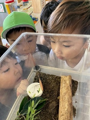 「カマキリにエサをあげよう」と捕まえたコオロギをケースに入れると、カマキリは、ササーッとコウロギを捕まえて食べ始めました。 子ども達は、「カマキリは、卵を産むから食べないと」と、その様子をじっと観察しています。