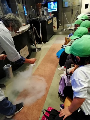 マイナス196度の液体窒素の実験コーナーで、二酸化炭素を冷やしてドライアイスにする実験をしています。講師の先生が「これが雲だよ」と液体窒素を床にまくと、「わぁ~、すごい」と歓声があがりました。