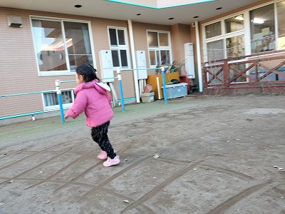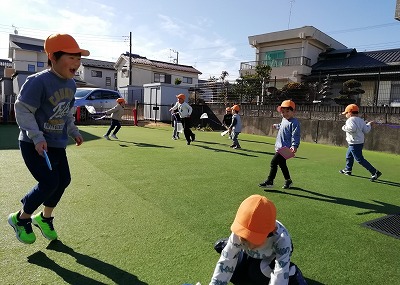 その後、園庭で羽根つきや、自分で作ったビニールの凧の凧あげなど、お正月の遊びもしました。羽根つきでは、羽根がなかなかまっすぐに飛ばず、何度もチャレンジしていました。
