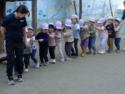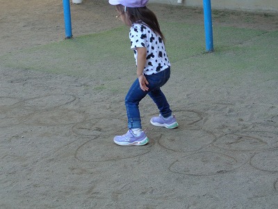 朝、園庭に出てきた子ども達が「何か描いてあるよー」「なんだ?? これは?」と騒いでいました。園庭の地面にアンパンマンや食パンマン、線路や星、ケンパーの丸などが描かれ、子ども達は早速遊び始めました。
