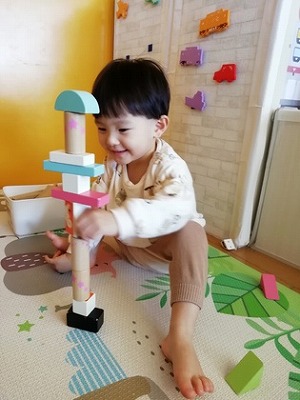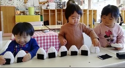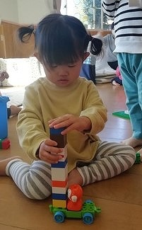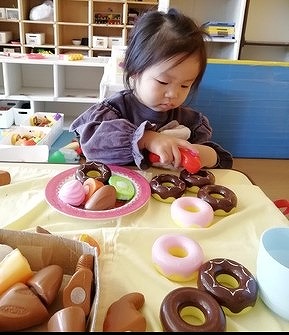 こちらでは、ブロックや積木を積みあげ、ままごとの食べ物を並べています。同じ食べ物を集めて並べる遊びがブームになっています。隣の子どもと「いっぱい~」「おにぎり!」と話しながら並べています。