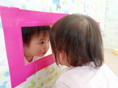 この0歳児のお子さんは、壁面に貼ったミラーをのぞき込んでいます。映った自分の姿をじーっとみて、ニコッと笑ったり、手でミラーを触ったり、鏡越しに保育者とコミュニケーションをとったりしています。「自分」を認識をする過程です。