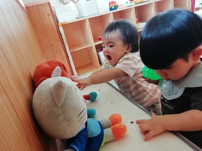 こちらでは、棚に置いてあるぬいぐるみに手を伸ばし、話しかけるようにしています。隣のお子さんは、棚の穴(丸)が気になり、しばらく指でさわっていました。「これはなんだろう?」「これは誰だろう?」…、そんな気持ちが部屋じゅうにあふれています。