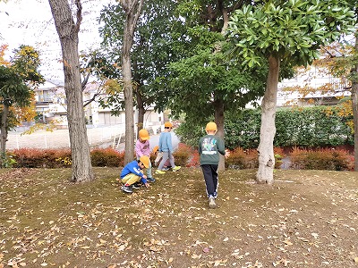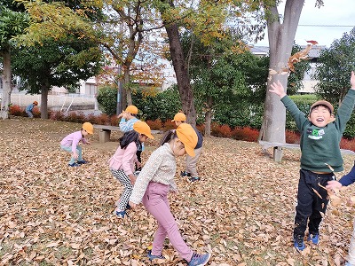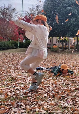 落ち葉一面の広場に寝転がり、落ち葉を舞い上がらせ、落ち葉の上を「カサカサ」という音を感じながらゆっくり歩き…。皆で、季節を感じました。