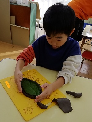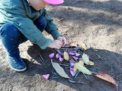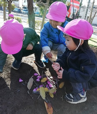 最近、夢中になっているのは、いろいろな落ち葉を集めたバーベキューごっこです。 「焼きますよ~」と火をつけるまねをして、「おにく~」「おいしいの、つくろうね~」「キャンプもしよう」と、子ども同士で話しながら料理をしていました。