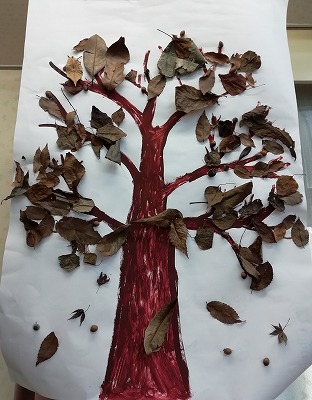 散策で見つけた落ち葉やドングリは、ごっこ遊びや製作の材料にもなり、子ども達にとっての宝物です。 保育者が大きな紙に木の幹や枝を描くと、子ども達が落ち葉を貼り始めました。「公園にあった大きな木みたい」と嬉しそうです。