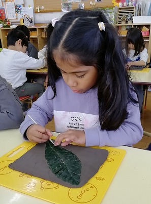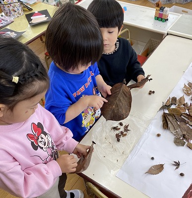さらに、葉っぱをよく見て、「みて~、線がある!」と葉脈や色、形の違いに気づいたり、「かたくなっちゃった」「カサカサする」と感触を言葉にしたり、「たまごがついてる!」と気づいたり、様々な発見がありました。