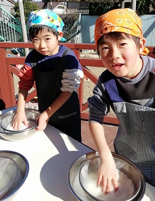 まず、年長児が前日にもち米とぎをしました。「お米とぎ、したことあるよ」「水が冷たい」「牛乳みたい」と話しながら、もち米の形や色を観察、とぐうちに水の色が変わったこともよく見ていました。