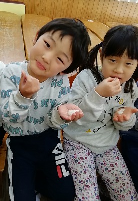 そして、次の日、もちつき前の「蒸かしたもち米の味見タイム」では、「とてもおいしい」「もっとたべてもいい?」と、何度もおかわりをしていました。匂いに誘われて、もちつきの様子を見にきた3歳児、4歳児クラスの子ども達も、もち米の味見をしました。「おいしい」「ご飯とちがう」「おもちみたいな匂いがする」と、いろいろな感想が聞こえてきました。
