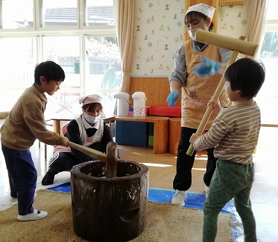 いよいよ、5歳児クラスのもちつきが始まりました。「よいしょ、よいしょ」のかけ声に合わせながら一人ずつ、もちをつきました。
