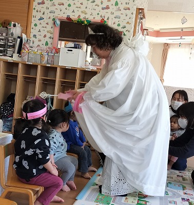その月に生まれた子どもに冠を届ける「エンジェルちゃん」 の登場で、誕生会が始まります。 子どもの紹介、インタビュー、出し物と続き、誕生日をお祝いします。