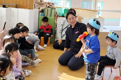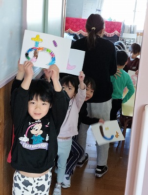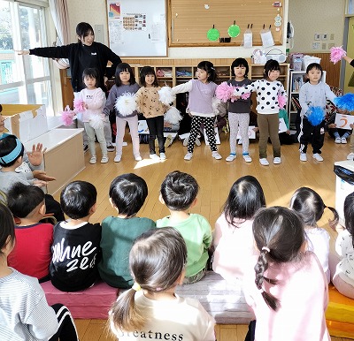 1月の4、5歳児クラスの誕生会、出し物は4歳児の担当でした。子ども達で話し合い、得意なダンスを披露することにしました。練習を見ていた保育者が「上手だね~、小さい子達にも見せてあげて」と言ったのを聞いていた子どもが「小さいクラスの誕生会でもやろうよ」と提案、皆も「そうだね。きっと喜ぶよ!」と、2、3歳児クラスの誕生会にもお祝いに行くことに決めました。