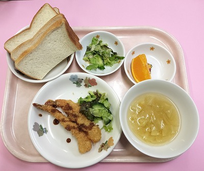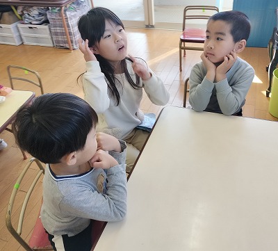 誕生会の日の給食メニューは、1月生まれの4、5歳児が相談して決めました。4歳児の一人が「エビフライがいいな」とリクエストすると、「いいね! エビフライにしよう! サラダは、ドレッシングを選べるものにしようよ」「スープもお野菜たっぷりに! コーンもいれて…」と5歳児の2人もアイディアを出して、給食室の先生に伝えました。