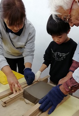 (写真)一人分の土を切り分けています。「やってみるか?」という先生の言葉に、大きくうなずき…。自分のお皿になる土ですから、切り出しは慎重に! 慎重に!