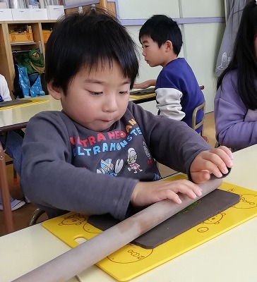 陶芸体験の日、準備した大きな土のかたまりを見て、子ども達は「大きい!!」「いつもの粘土とは違う」「匂いも違う」と口々に言っていました。先生に教わりながら、お皿を作るために1枚ずつ切るところからスタートし、早速、葉っぱのお皿や四角いお皿など、3つ、作り上げました! 「もっと作りたい!」という声に、先生も「コップも作ってみようか」と応え、コップ作りにも挑戦しました。