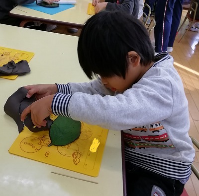 「おばけもつくりたい」と、落ち葉に切り込みを入れて目と口をつけました。