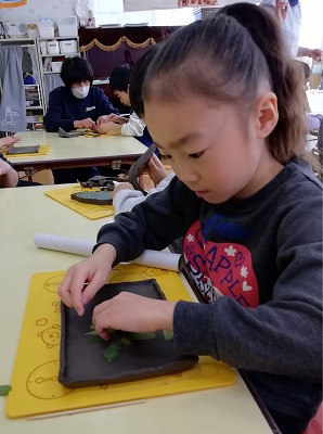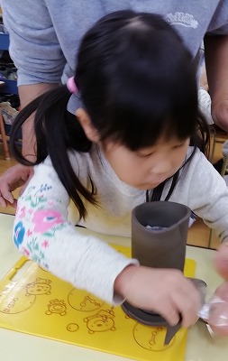 紙粘土で、ごっこ遊びに使うものやブローチなどを作ってきた子ども達が、「自分のお皿とかを作ってみたい」と思い始め、皆で調べてみたところ、土を焼くことで皿やコップになると知りました。では、実際に作ってみよう!と、陶芸の先生をお招きしました。