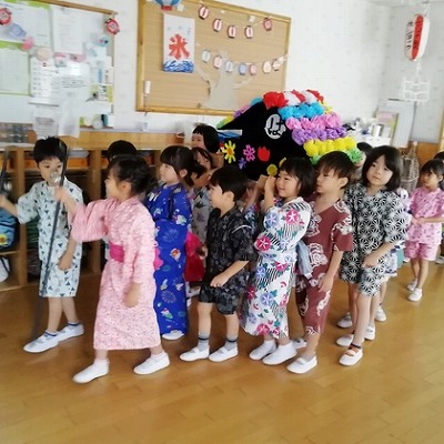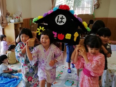 5歳児クラスの子ども達は、「柏鳳保育園の『は』も書いたよ」と、みんなで作った自慢のみこしを担いで「わっしょい! わっしょい!」と、園内を練り歩きました。盆踊りの掛け声も園内に響き渡りました。
