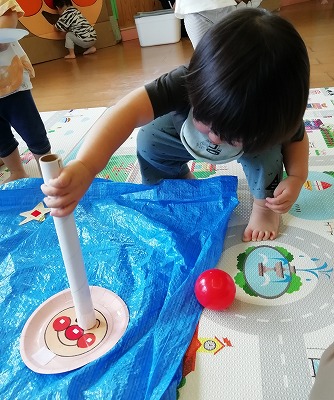 2階では、5歳児クラスの子ども達が「いらっしゃい! ワニワニパニックにどうぞ!」「ボーリングもできるよ」と2つの店を出しました。 穴から出たり入ったりするワニ(ワニに見立てた手)にタッチをする「ワニワニパニック」に、みんな、夢中です。