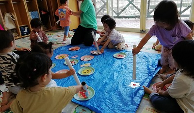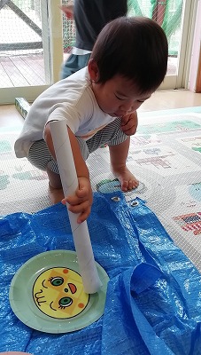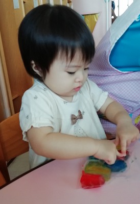 1歳児クラスの子ども達は、スプーンやカップを使いました。手で握って感触を味わったり、スプーンを使ってカップに入れたりしています。 色を混ぜて「きれい!」と喜び、いろいろな色を混ぜていました。