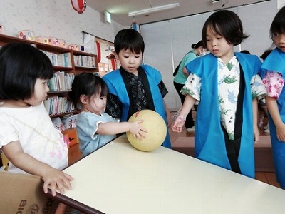 ボーリングゲームでは、小さいクラスの子ども達も、お兄さんの話をよく聞いて遊んでいました。「ここからボールを転がすよ。よく狙ってボールをはなしてね」と、教え方もじょうずです。