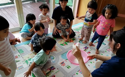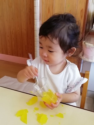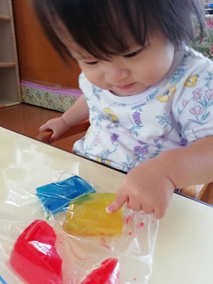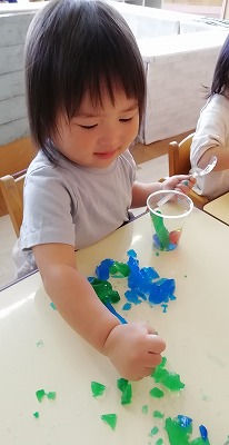 園では、小麦粉、寒天、片栗粉、高野豆腐、春雨、氷、水など、身近にあるいろいろな素材を使って、感触遊びをしています。今回は、寒天を使った時の様子をお伝えします。