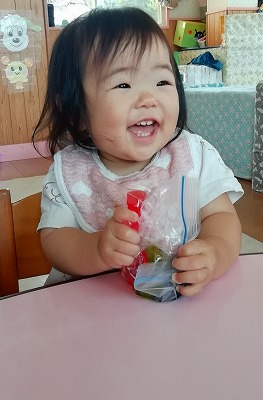 0歳児クラスの子ども達は、初めての体験。まず、指でそーっと、つついています。そして、だんだん指先に力を入れて押し始めました。塊だった寒天がプシューと分かれることがわかると、両指で押し始めます。