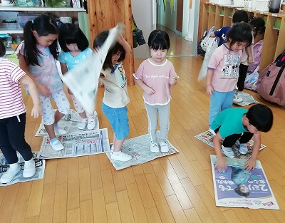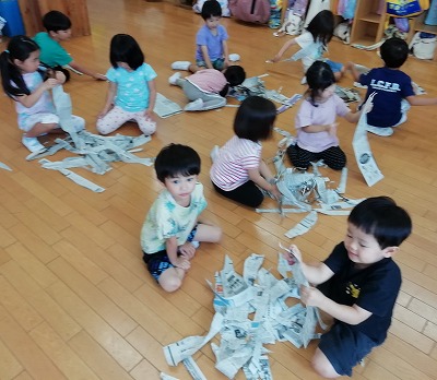 この日、4歳児クラスの子ども達は、頭と体を目一杯使って、新聞紙で遊んでいました。