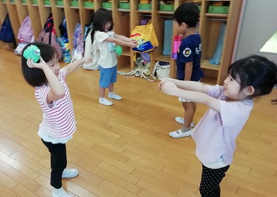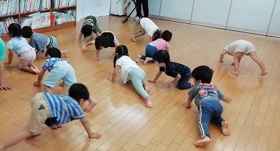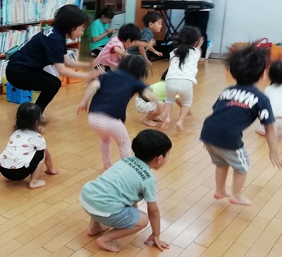 リズム遊びでは、音に合わせて動いたり止まったり。カエルやクマなどの模倣も取り入れ、表現しています。