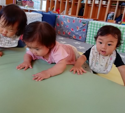 たとえば、0歳児クラスのうんどう遊びでは、マットで作った小山の上り下りや、トンネルくぐり、デコボコ道など、全身を使った動きになるよう置き方を工夫しています。
