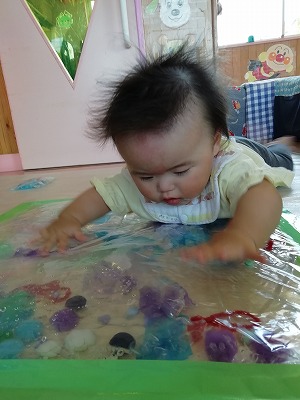 床に置いたセンサリー・トイの上で足を動かしたり、体を回転させたり、また、中に入っているデコレーション・ボールに触ろうと手を伸ばすなど、感触を確かめています。