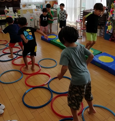 3、4、5歳児クラスでは、サーキット遊びやリズム遊びを取り入れています。サーキット遊びでは、リズミカルにフープを跳び、ジャンプ・マットでは両足を揃えてジャンプ。