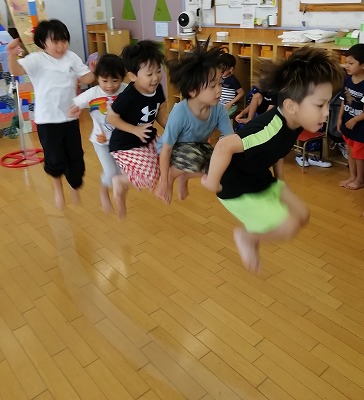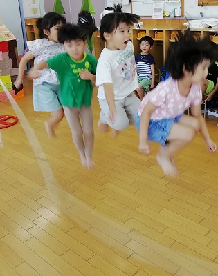 5歳児クラスでは、長縄跳びがブームになっています。連続跳びができるようになり、今は、グループで一緒に跳ぶ練習もしています。 みんな、迫力抜群の跳び方です!