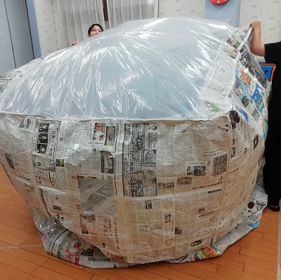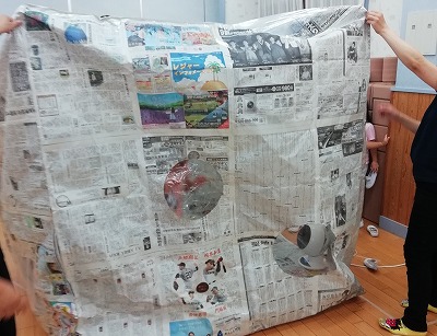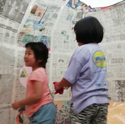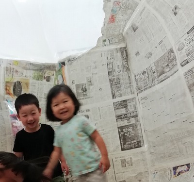 前回、新聞紙を使った遊びの様子をお伝えしましたが、今回も新聞紙です! 新聞紙をつなぎ合わせて「新聞紙ドーム」を作りました。