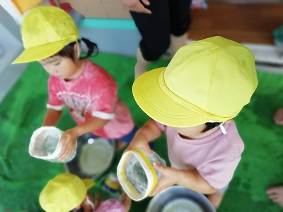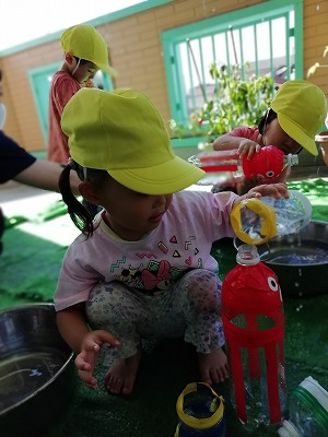 まだまだ暑い日が続きます。暑さ指数をチェックしながら、日陰で水遊びをする日もつくっています。
