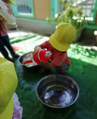 今度は、ペットボトルからたらいに水を集め始めました。「いっぱいになぁ~れ!」