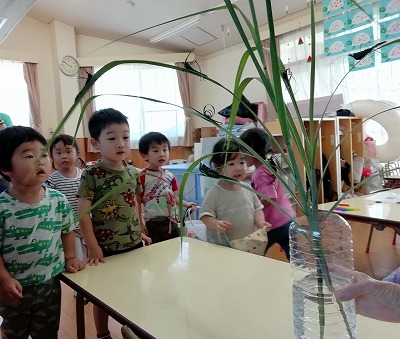 2、3歳児クラスの子ども達は、本物と思ったのか、少し離れた場所から、じっと見ていました。 バッタもカタツムリも動かないので、なんとも不思議そうな表情です。